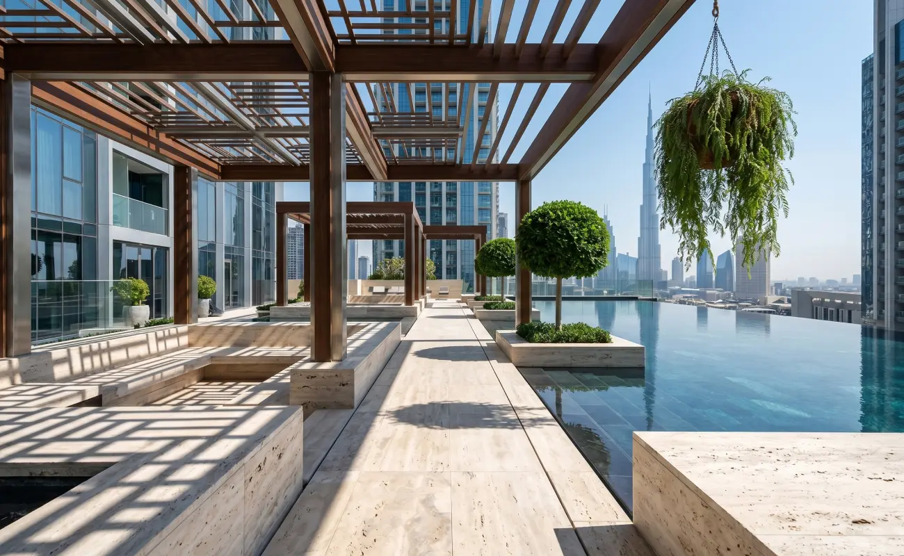 Porcelain tiles and natural travertine are still among the strongest choices for pool surrounds in Dubai. Travertine, especially, handles heat well. It tends to stay cooler underfoot than many other finishes, which matters more than people think once summer arrives properly. It also ages well visually. In a climate like this, that is not a small advantage.