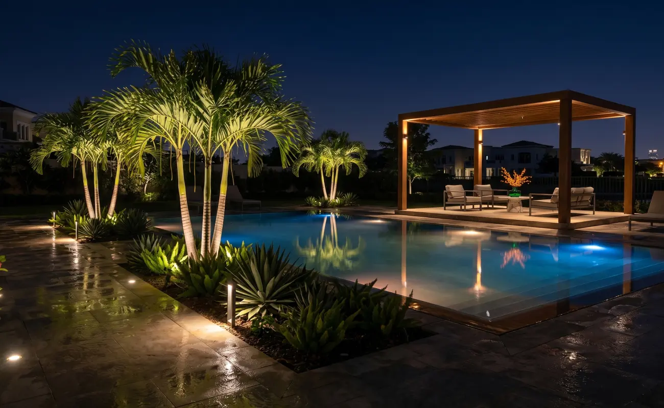 A good lighting plan works in layers. Underwater LEDs set the tone. Soft light on pergolas or boundary walls gives the space depth. Path lights help with movement without becoming harsh. Uplighting on palms or strong architectural planting adds just enough drama without making everything feel overdesigned.