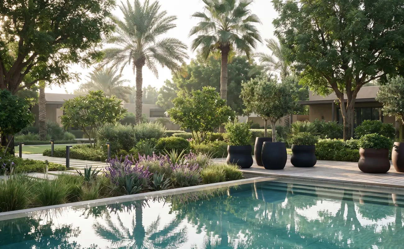 Irrigation matters here as well. Around pools, it needs more care than a normal garden bed. Drip systems positioned properly keep plants healthy without creating extra moisture around hardscape or puddles in places people walk through regularly. Smart irrigation helps too, especially because Dubai’s seasons may not feel dramatic in the way they do elsewhere, but they still affect plant needs and water use.
